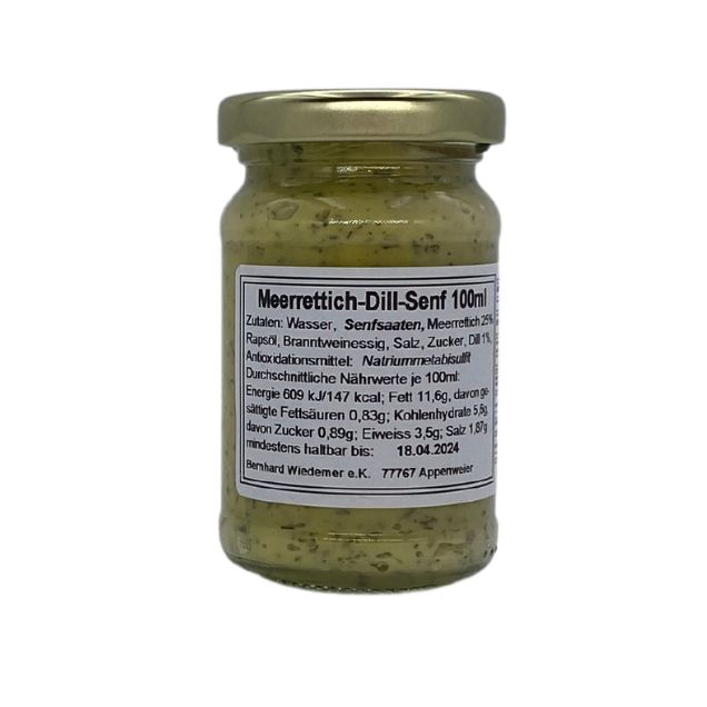 Zutaten: Senfsaaten, Meerrettich 25%, Dill 1%, Wasser, Rapsöl, Branntweinessig, Salz, Zucker, Antioxidationsmittel: Natriummetabisulfit