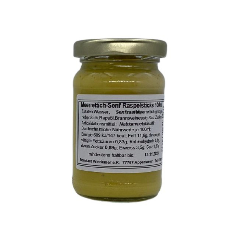 Zutaten: Senfsaaten, Meerrettich grob gerieben 25%, Wasser, Rapsöl, Branntweinessig, Salz, Zucker, Antioxidationsmittel: Natriummetabisulfit