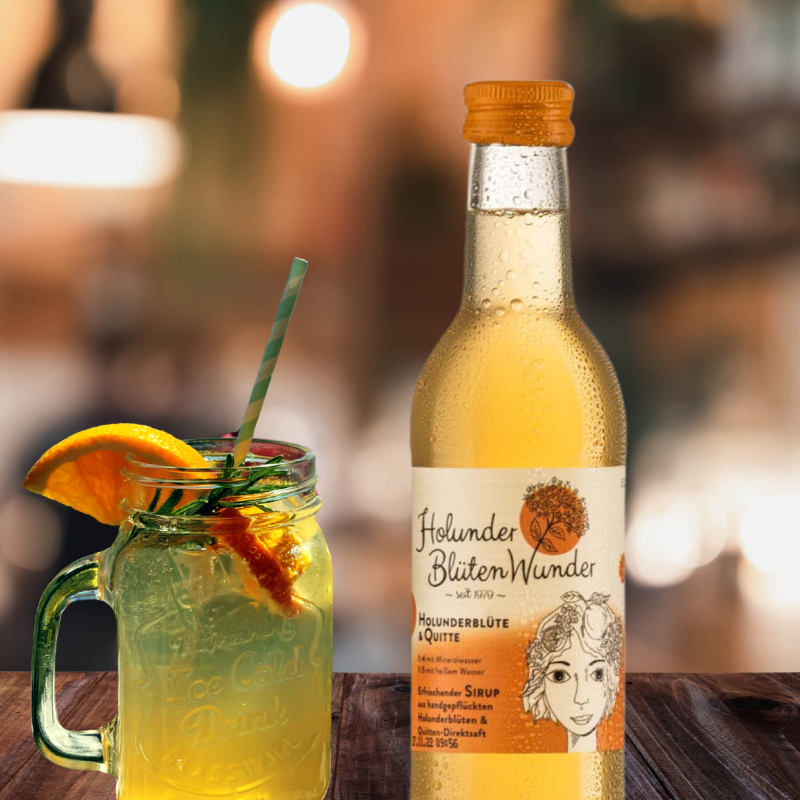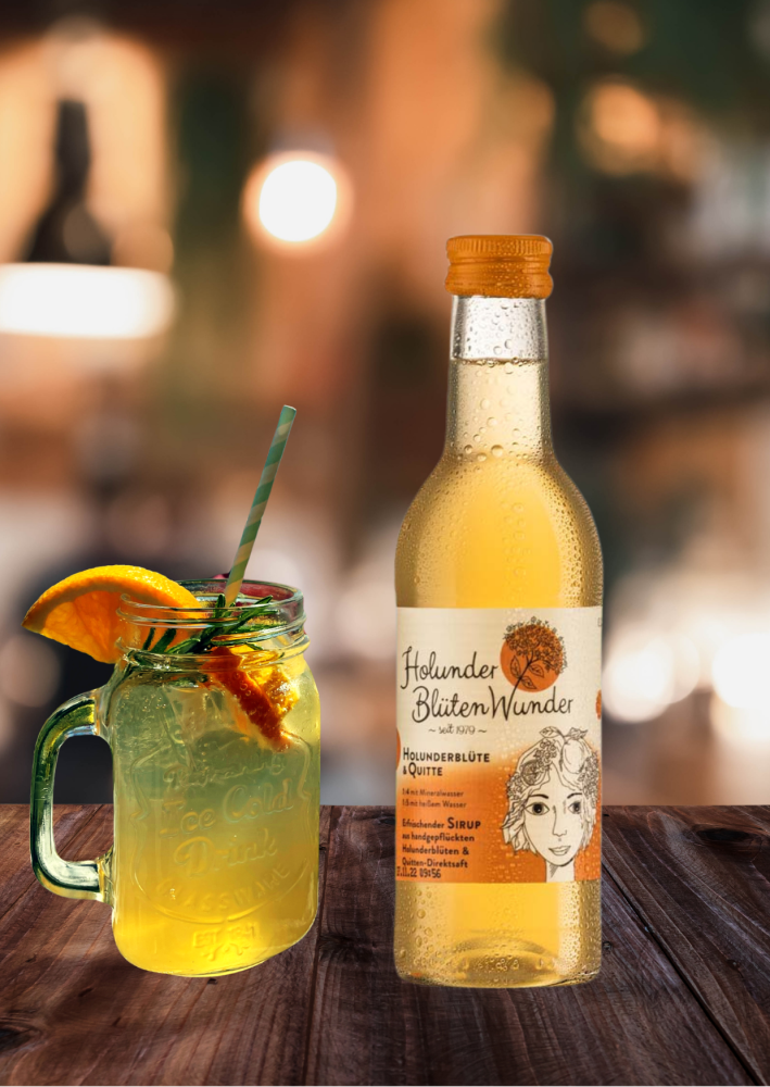 Bio Holunderblütensirup mit Quitten Direktsaft – die Limo zum Selbermachen für dein Zuhause. Erfrischung pur – bekannt aus unserem Restaurant!
