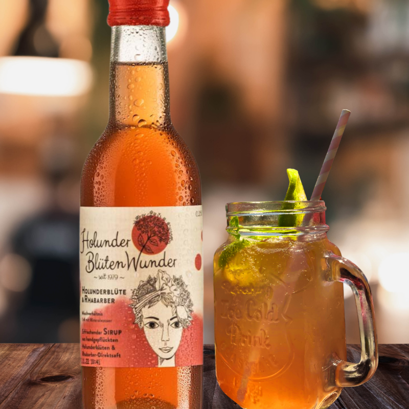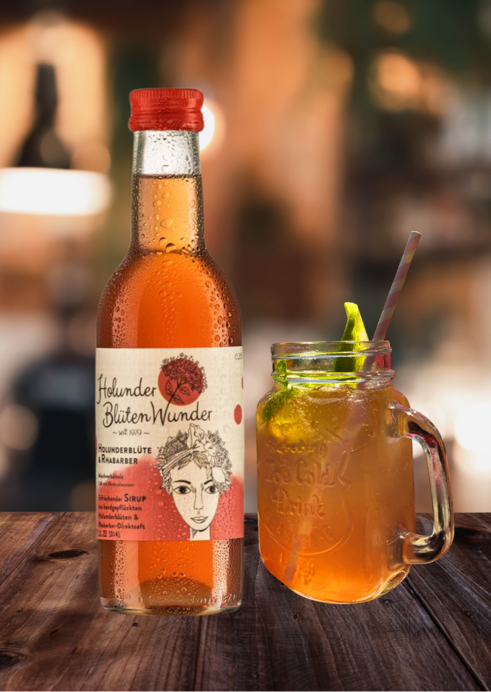 Bio Holunderblütensirup mit Rhabarber Direktsaft – die Limo zum Selbermachen für dein Zuhause. Erfrischung pur – bekannt aus unserem Restaurant!